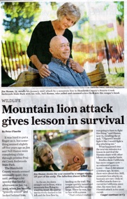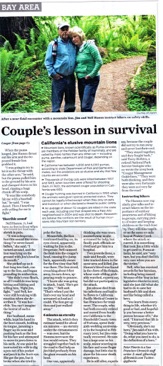 In early June 2012, I visited my friends Jim and Nell Hamm at their home in Fortuna. We spent a wonderful day hiking the trail at Prairie Creek Redwoods state Park in Humboldt County where Jim was attacked by a mountain lion more than five years earlier. I snapped this picture of them at the exact spot of the attack (where Nell fought off the lion, ultimately saving Jim’s life). Meanwhile, the San Francisco Chronicle was working on an update story and the reporter contacted me. I sent along several pictures, including this one, which ran with the lengthy Sunday feature. A link to the full story can be found here. http://www.sfgate.com/bayarea/article/Couple-s-lesson-in-survival-from-07-cougar-attack-3658073.phpshapeimage_4_link_0
