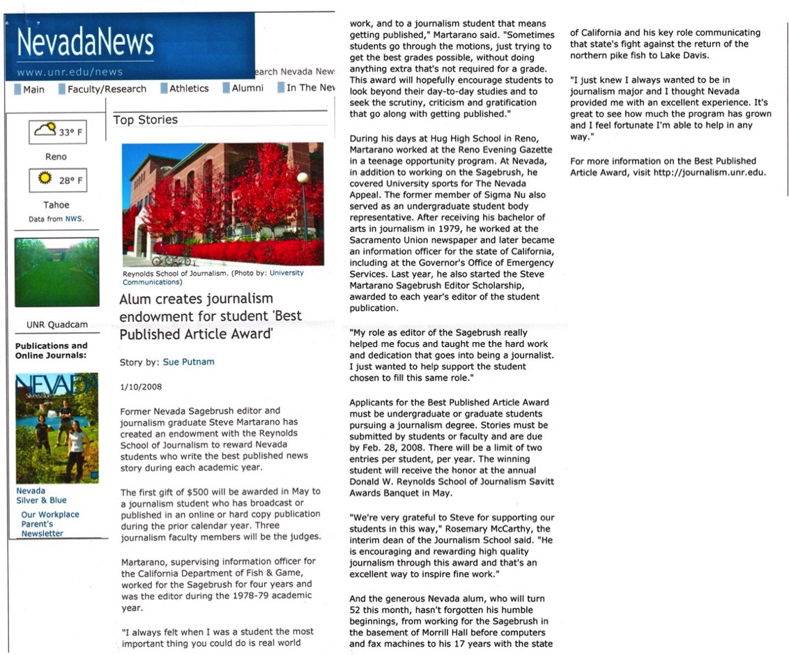 Best Published Story Award/Nevada News/Jan. 11, 2008