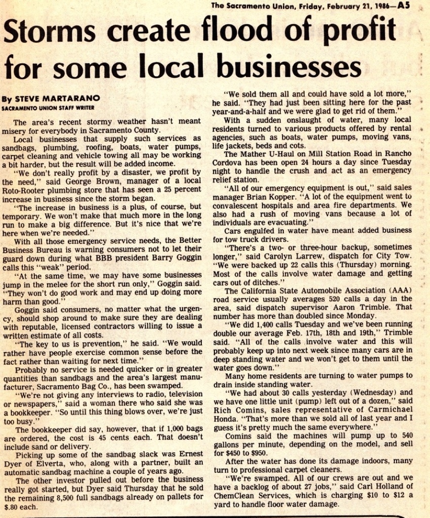 Storms create flood of profit/Sacramento Union/Feb. 21, 1986