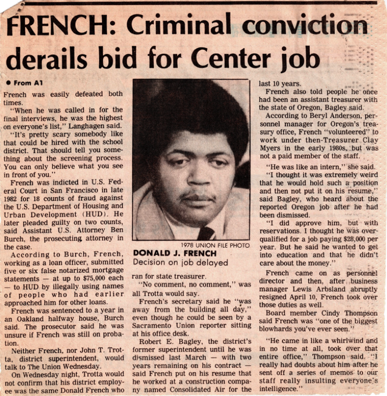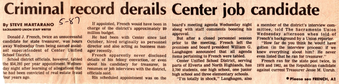 Criminal Record Derails Center Applicant/Sacramento Union/May 21, 1987