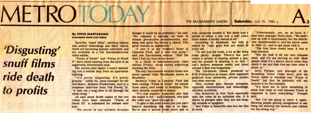 “Disgusting” Snuff Films Gain Profits/Sacramento Union/July 20, 1985