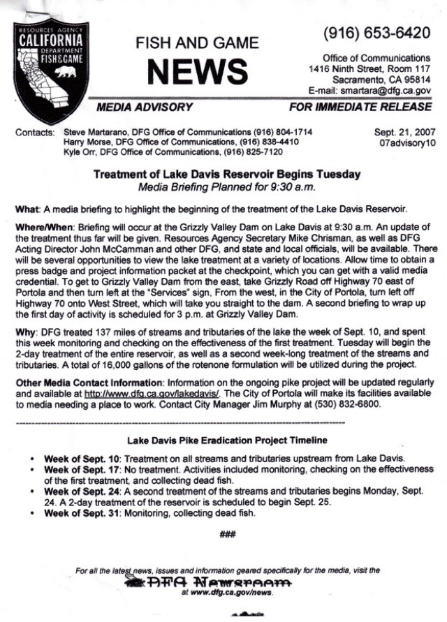 DFG News Release: Lake Treatment Begins Tuesday/Sept. 21, 2007
