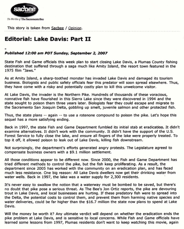 Editorial: Lake Davis Part II/Sacramento Bee/Sept. 2, 2007