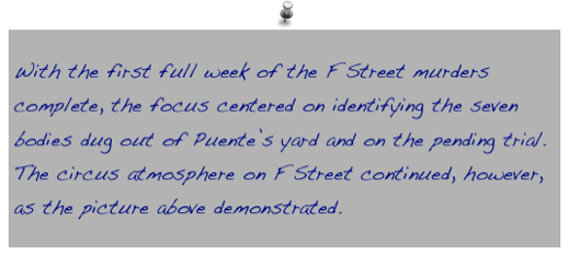 Welcome      About Me      Photography       Assorted Pieces      Puente F Street Murders      Featuring . . .       The Sporting Life
