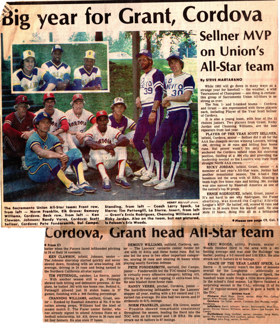 The 1983 team was the last All-Metro team I picked before leaving sports, and it’s highlighted by Ricky Jordan, who went on to a great major-league career. Also, note buried in the names for infielders on the second team is current Sacramento mayor and former NBA star Kevin Johnson, who was a pretty decent little shortstop.