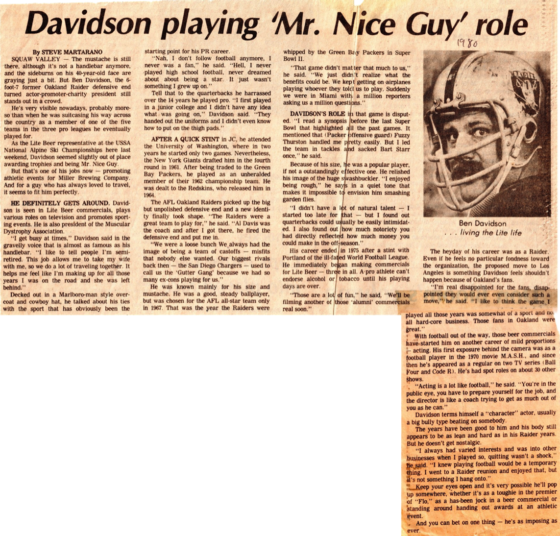 I went up to Squaw Valley for a few days to cover the National ski championships and ran into the old Oakland Raiders favorite Ben Davidson at a party sponsored by Lite Miller beer. This was when Davidson was doing those now-famous Lite Beer commercials, and he was a great interview.
