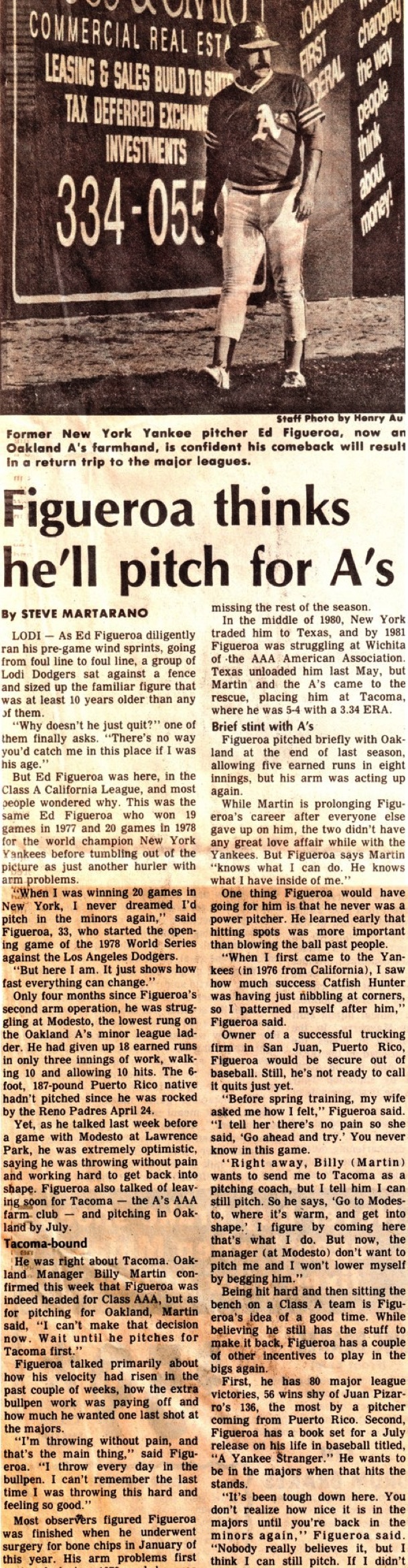 A familiar story in the minor leagues involves the aging former major leaguer hanging on for one last shot at the big time. The Ed Figueroa story was different, in that he was a 20-game winner for the World Series winning New York Yankees just a few years before, and I remember him being incredibly frank in this interview.