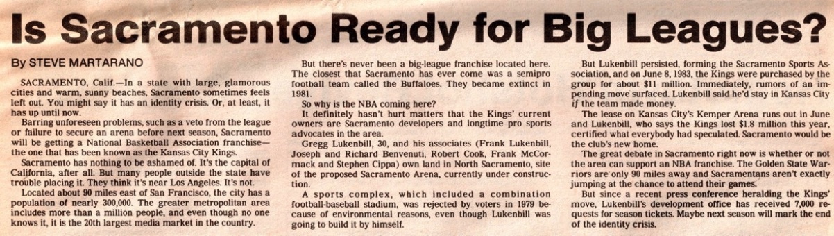 I had left sports a couple of years before, but after it was announced that the Kings were moving to Sacramento, a contact at The Sporting News -- where I had written several stories in the past -- asked me to write on the Kings. I gladly obliged, and it turned out to be the only story I’ve ever written on the Kings.