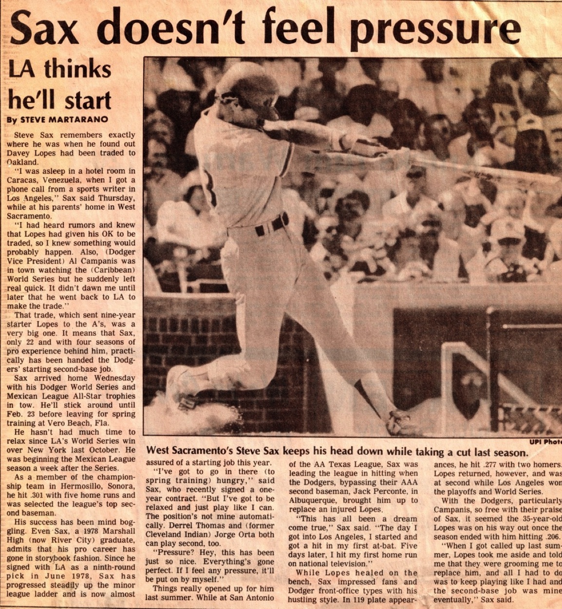 Obviously, Steve Sax’s meteoric rise through the Dodgers system meant a lot of good stories for me. To interview him, I went to the West Sacramento home of Sax’s parents and I remember Sax suddenly stopped talking when a TV report on the Davey Lopes trade came on. Like a little kid watching a Christmas special, Sax leaned on one hand in front of the TV to get a better look. It would be a magical next 12 month for Steve, as 1982 ended with him being named the NL Rookie of the Year.